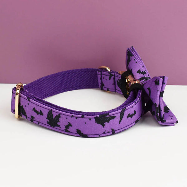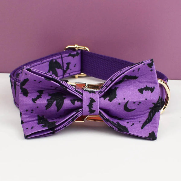 Gift this purple Halloween dog collar, harness with spooky design, flower / bowtie, adjustable buckle, and festive charms to your fur buddies. With a beautiful Halloween design, this pet collar make your pets look pretty! This Collar, harness comes with a Flower / Bowtie. These fur-friendly fabrics were personally handpicked by us and are carefully hand-stitched to give a raw appeal and ecstatic look for your fur friends.